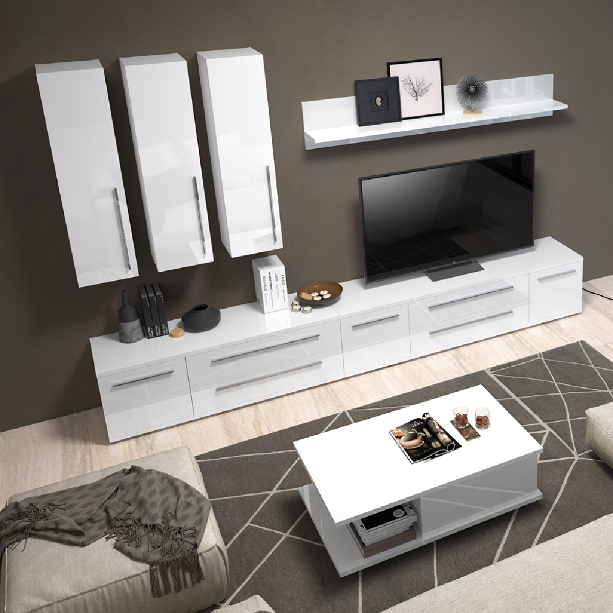 O comodă TV înaltă modernă, elegantă și funcțională pentru living.