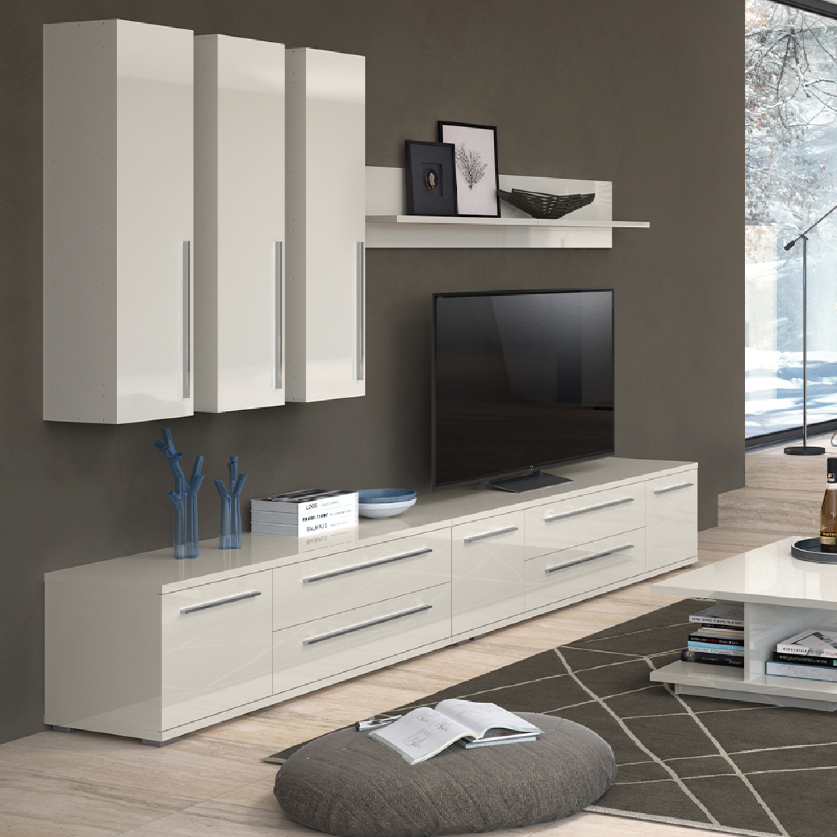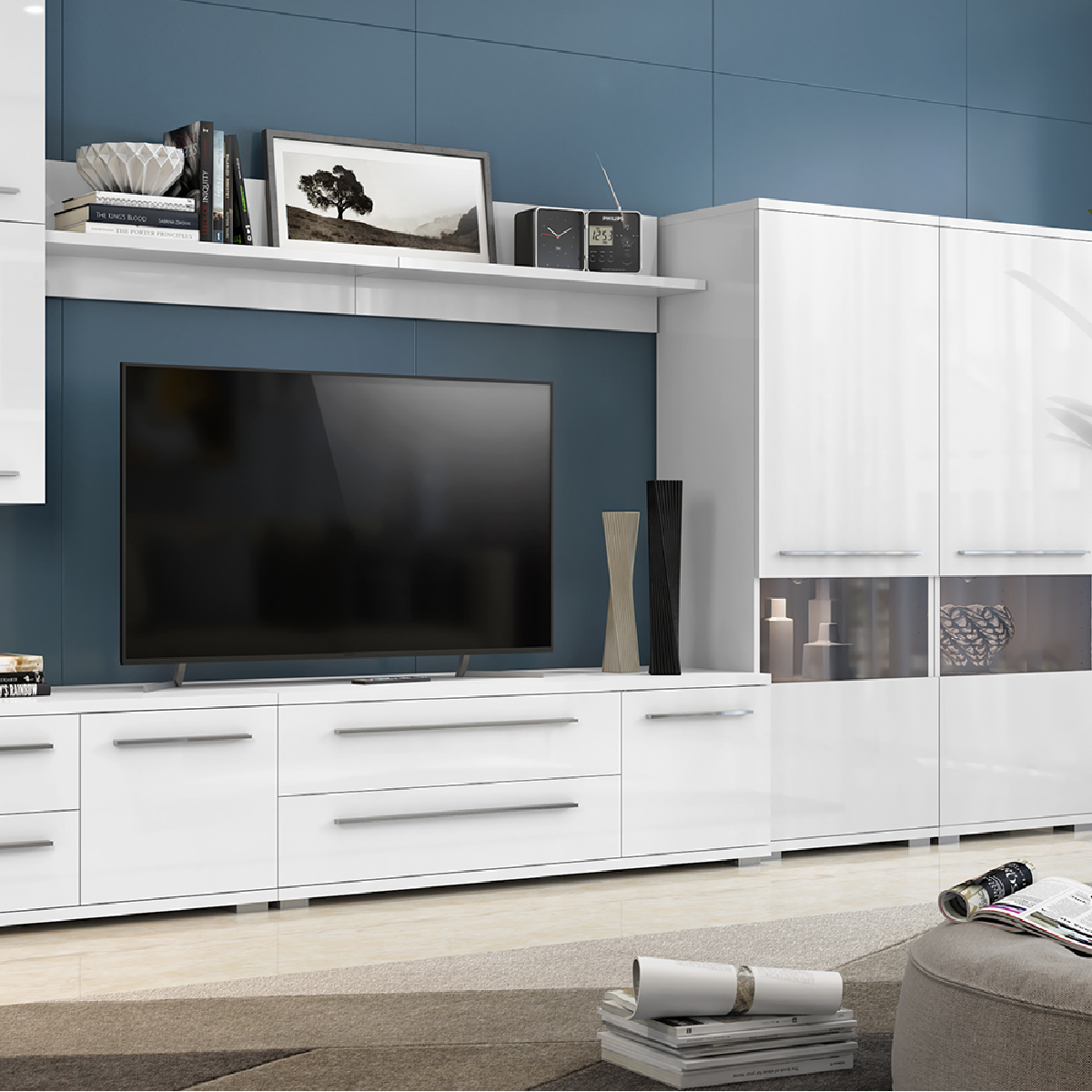 O comodă TV înaltă modernă, elegantă și funcțională pentru living.