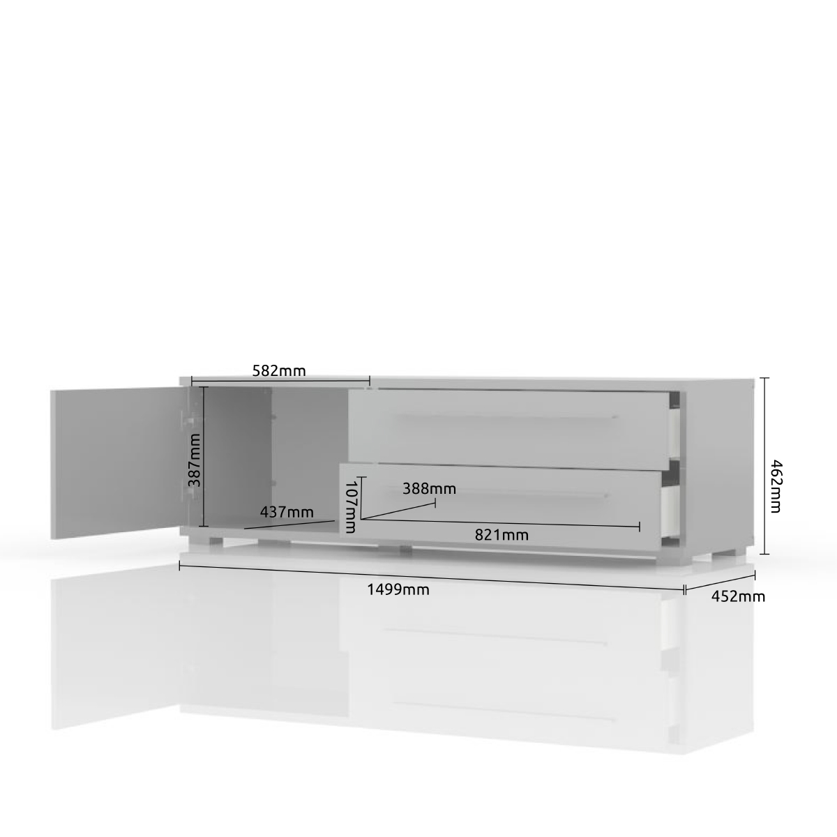 Comodă TV pentru living din colecția Piano, adaptat pentru spații mici, cu o ușă (60 cm) și două sertare (90 cm).