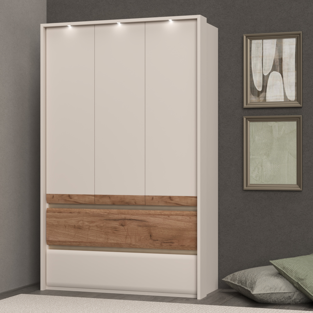 Ușile elementului sunt complet acoperite cu lac UV pe bază de apă cu efect mat delicat, în culoarea cașmir, cu o aplicație de MDF profilat cu decor din lemn Stejar Tobacco;