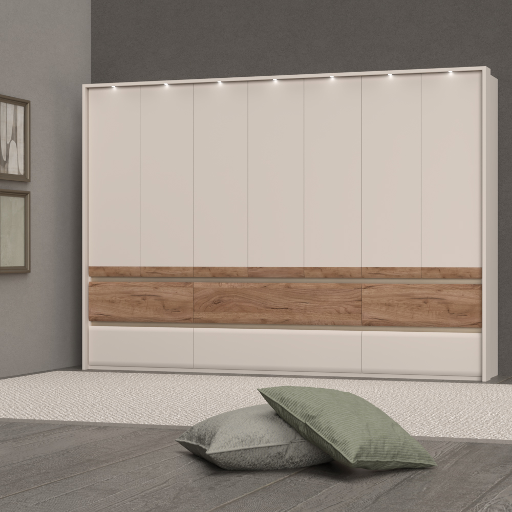 Dulap pentru dormitor din prestigioasa colecție Invictus, cu șapte uși și șase sertare, forme armonioase și moi ale părților din față.